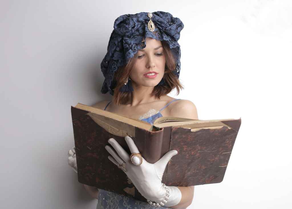 A woman wearing a vintage hat and gloves reads an old book indoors.